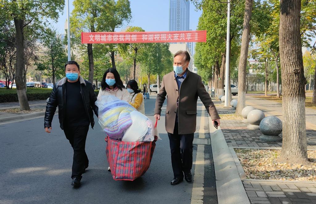 党委委员、副校长李红革(右1)为返乡学子搬运行李